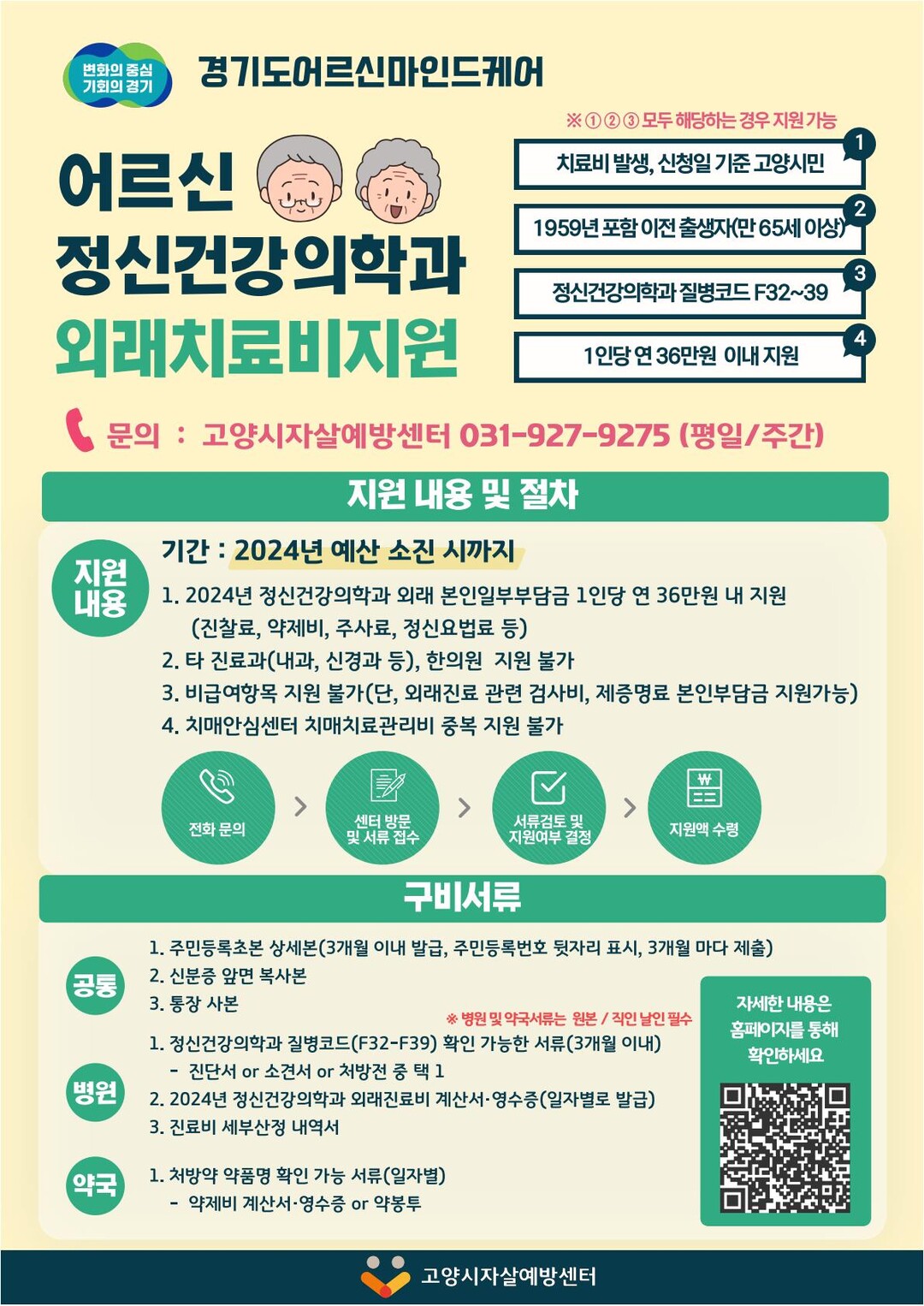 경기도 어르신 마인드케어는 정신건강의학과에서 질병코드 F32~39(우울증 및 기분장애)를 진단받고 외래치료를 받고 있는 65세 이상(1959년 포함 이전 출생자)인 고양시민을 대상으로 2024년에 발생한 정신건강의학과 외래진료비 중 본인일부부담금 연 36만원을 지원한다.