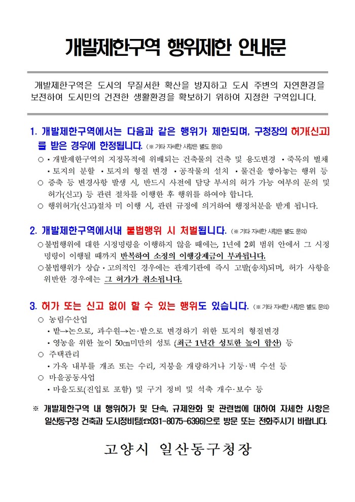 [부자동네타임즈 김인수기자] 고양특례시 일산동구는 개발제한구역의 무질서한 난개발 방지와 자연환경 보전을 통해 시민의 건전한 생활환경과 국토의 쾌적한 보존을 위하여 개발제한 구역 내 행위제한에 대한 홍보를 강화한다고 밝혔다.