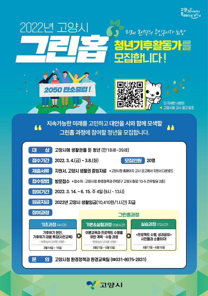 [부자동네타임즈 김인수기자] 고양시가 탄소중립 사회를 선도하는 청년세대와 적극 협력하기 위해 청년기후환경활동가(그린홉) 과정 참여자를 3월 4일부터 3월 8일까지 모집한다.
