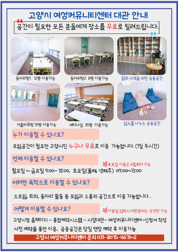사전신청은 고양시청 홈페이지 통합예약시스템을 이용하면 된다. 대관료는 무료로 5월 현재 운영시간은 평일 오전 9시부터 오후 6시까지다.