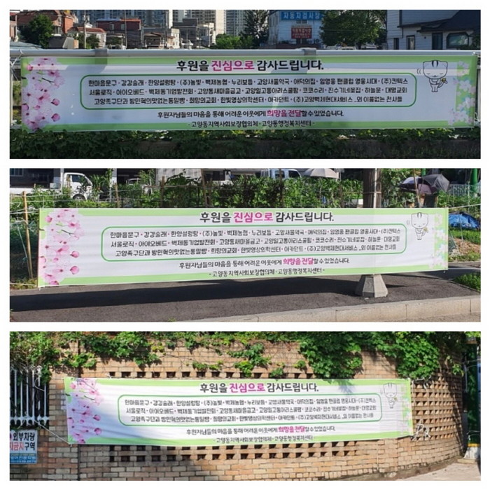 감사 현수막은 지역사회 상생을 비전으로 쉼 없는 나눔 활동을 이어가고 있는 고양동지역사회협의체(민간 위원장 김준태)의 발자취를 조명하는 한편 주민에게 ‘누구나 나눔에 참여할 수 있다.’는 인식을 심어주고 있다.