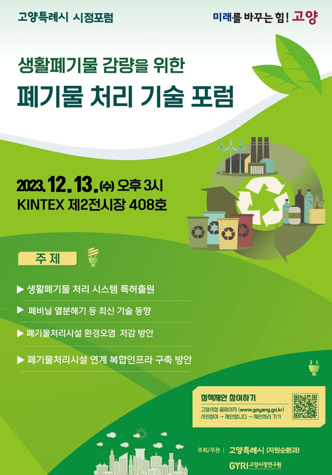 포럼에 의견을 제시하고 싶은 시민과 지자체, 공공기관, 기업, 연구소 관계자는 포스터에 있는 큐알(QR)코드를 통해 다양한 생활폐기물감량 및 폐기물처리기술에 대해 의견을 제출할 수 있다.