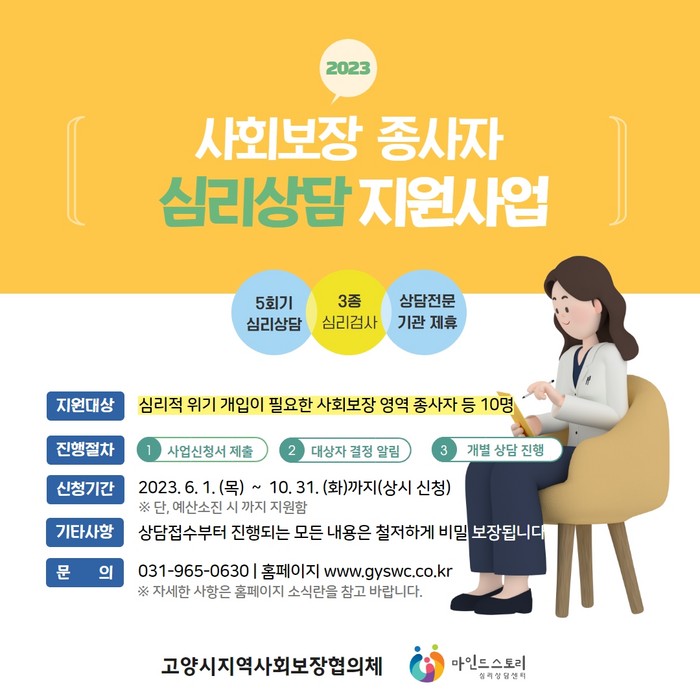 이런 상황에서 시는 제5기(2023~2026) 고양시지역사회보장계획 사업에 따라 사회복지시설 종사자의 처우와 노동 환경을 개선하기 위해 마인드스토리심리상담센터와 연계해 심리상담 지원 사업을 실시한다.