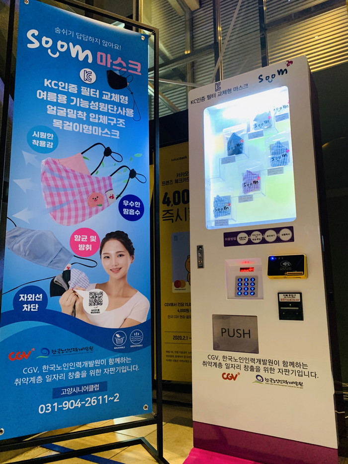 이와 더불어 SOOM 마스크에 대한 시민들의 접근성을 높이기 위한 방안으로 고양시, 한국노인인력개발원, CGV일산점 등 관련 기관이 적극적으로 협력해 마스크 자판기 제작 사업을 추진하게 됐다.