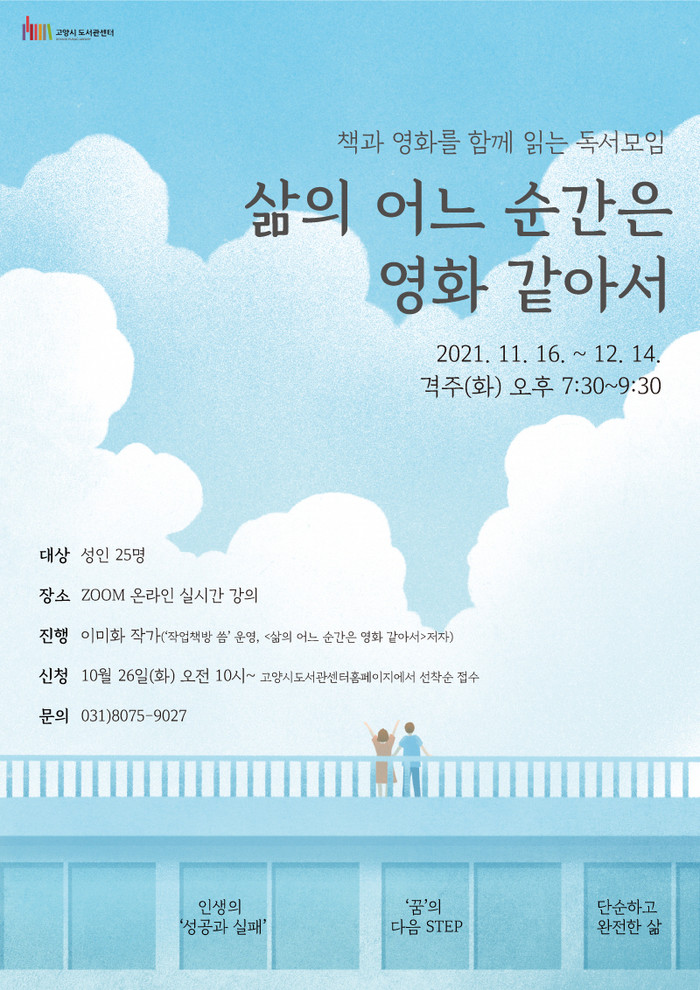 [부자동네타임즈 김인수기자] 고양시 도서관에서는 책과 영화를 같이 읽는 독서모임인 삶의 어느 순간은 영화 같아서를 11월 16일(화)부터 진행한다.