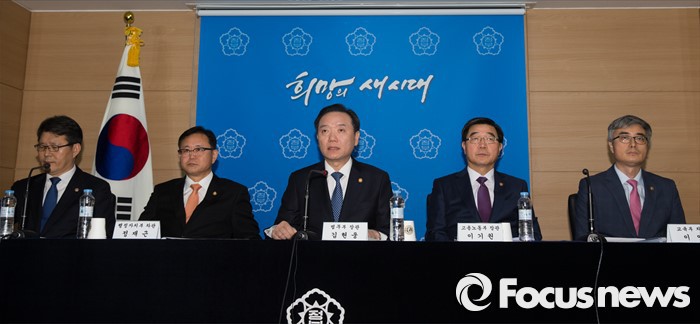 | △ 김현웅 법무부 장관, 이기권 고용노동부 장관, 여인홍 농림축산식품부 차관, 이영 교육부 차관, 정재근 행정자치부 차관이 13일 오전 서울 종로구 세종대로 정부서울청사 브리핑룸에서 14일 역사교과서 국정화 고시 철회와 노동 개혁을 규탄하는 민중총궐기 도심 집회 관련 관계부처 합동담화문을 발표하고 있다. <사진제공=포커스뉴스> |