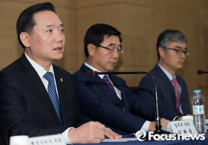 | △ 김현웅 법무부 장관(왼쪽부터), 이기권 고용노동부 장관, 이영 교육부 차관이 13일 오전 서울 종로구 세종대로 정부서울청사 브리핑룸에서 14일 역사교과서 국정화 고시 철회와 노동 개혁을 규탄하는 민중총궐기 도심 집회 관련 관계부처 합동담화문을 발표하고 있다. <사진제공=포커스뉴스> |