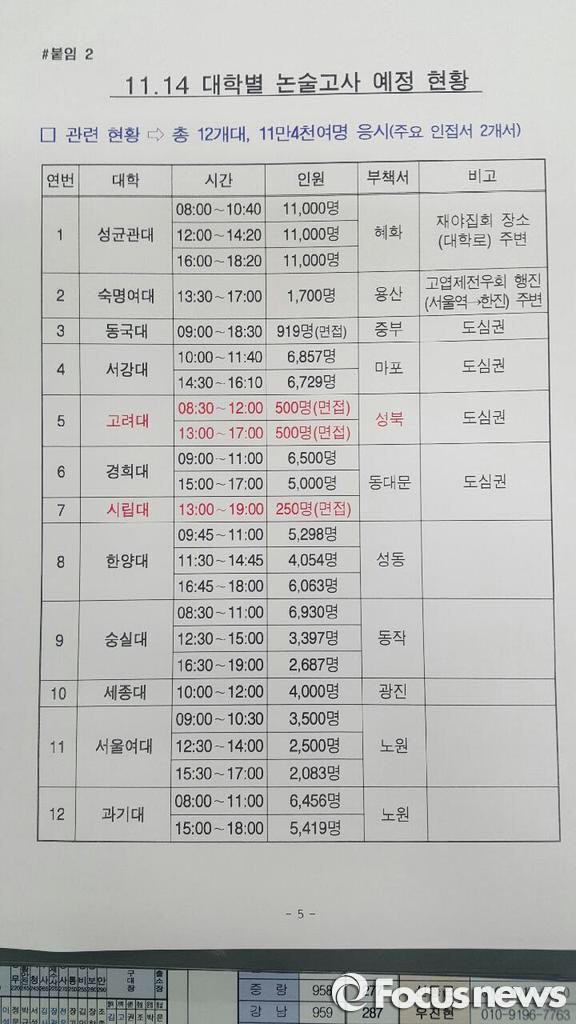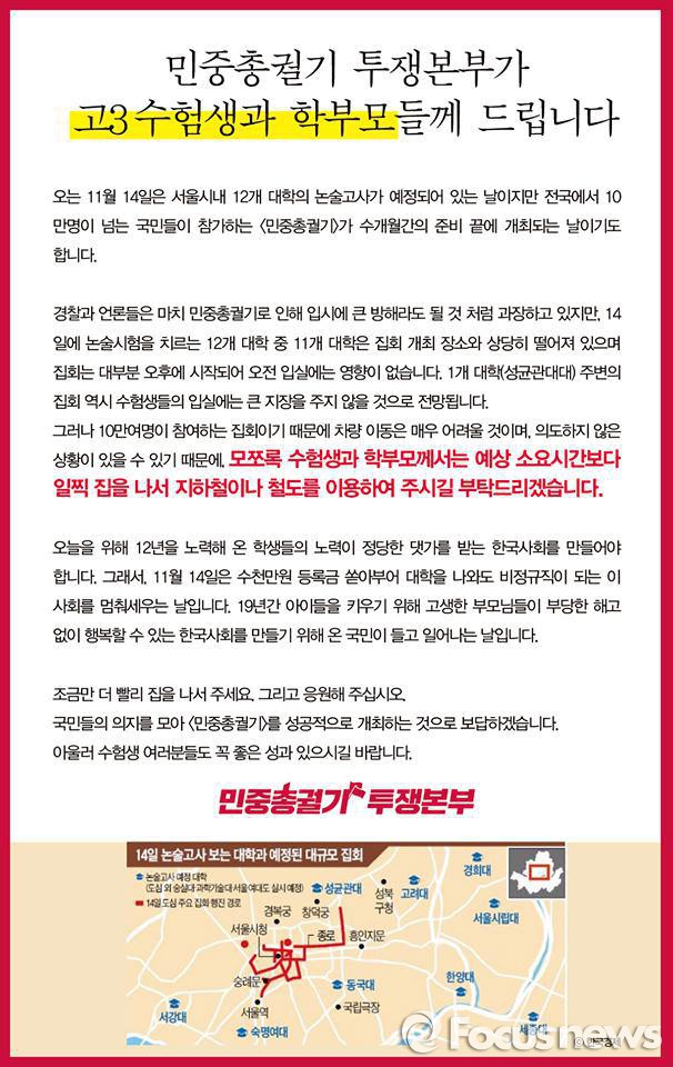 민주노총은 울러 "당일 논술시험을 치르는 12개 대학 중 11개 대학은 집회장소와 멀어 집회에 영향을 받지 않고 숙명여대 등 다수의 학교는 오전에 시험을 치르므로 오후에 열리는 시위상황과 관련이 없다"며 "그러나 성균관대 등 일부 오후 수험생들에게 불편이 있을까 우려되지만 집회 집결지인 서울광장, 광화문으로부터 도보로 4km 이상 거리라 집회 영향은 최소화 될 것"이라고 밝혔다.