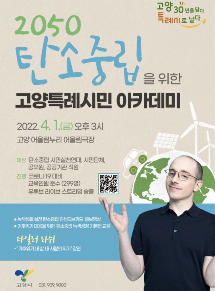 [부자동네타임즈 김인수기자] 고양시(시장 이재준)는 2050 탄소중립을 위한‘고양특례시민 아카데미’를 오는 4월 1일 어울리누리 어울림 극장에서 개최한다. 이날 방송인 타일러가 특별출연해 강연을 펼칠 예정이다.