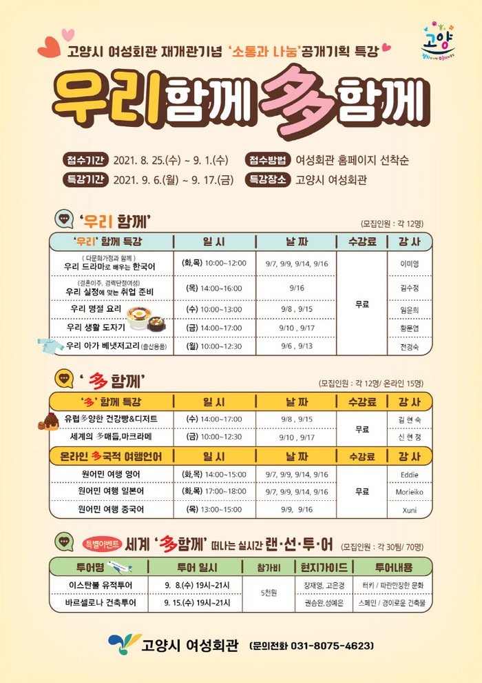 [부자동네타임즈 김인수기자] 고양시 여성회관이 재개관을 기념해 ‘소통과 나눔’이라는 메시지를 담은 특별 공개강좌 우리함께 多함께를 오는 9월 6일부터 2주간 운영한다.