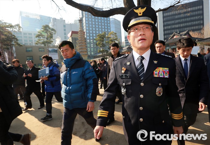 | △ 8일 오전 서울 종로구 조계사를 찾은 구은수 서울지방경찰청장이 삼배를 마친 후 대웅전을 빠져나오고 있다. 구 청장 뒤로 한상균 위원장이 머물고 있는 관음전(왼쪽 건물)이 보이고 있다. <사진제공=포커스뉴스> |