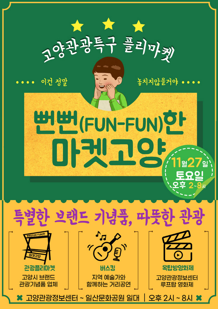 [부자동네타임즈 김인수기자] 고양시가 27일 관광정보센터 뒤뜰에서 관광 플리마켓인 ‘펀펀(Fun-Fun)한 마켓’을 개최한다.