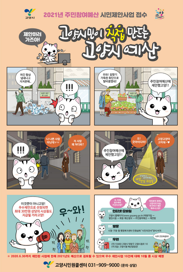 김운영 고양시 기획조정실장은 “시민의 안전이 최우선이라는 마음으로 지속적으로 추이를 살펴 10월에 예정되어 있는 시민참여예산 한마당도 온라인 운영을 고안할 계획”이라며, “이런 때일수록 생활 속 불편사항을 개선하고 필요로 하는 부분을 반영해주는 시민밀착형 사업을 확대하여 시민들의 마음을 어루만져 주어야 한다. 6월말까지 진행되는 시민제안사업 공모에 활발히 참여해 달라.”고 시민들의 관심과 협조를 구했다.
