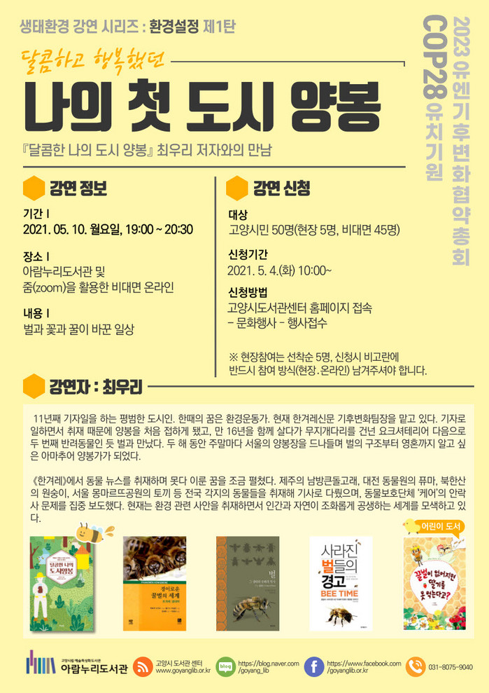 [부자동네타임즈 김인수기자] 고양시 아람누리도서관은 ‘달콤하고 행복했던 나의 첫 도시 양봉’강연을 오는 5월 10일 실시한다.