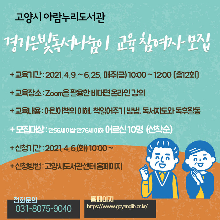모집 대상은 만 56세 이상 만 76세 이하의 고양시민 어르신 10명이며, 선착순으로 모집한다. 오는 6일 오전 10시부터 고양시도서관센터 홈페이지에서 신청 받는다. 기타 문의 사항은 아람누리도서관으로 하면 된다.