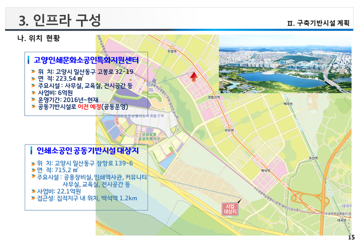 고양시가 최종 선정됨에 따라 시는 장항동 일대를 인쇄소공인 집적지구로 지정하고 국·도비 12억 원, 시비 10억 원 등 총 22억 원을 투자해 2022년 중반에 인쇄역사관, 공용장비실, 디자인 커뮤니티, 디자인 교육장, 회의실 등이 갖춰진 공동기반시설을 구축할 예정이다.