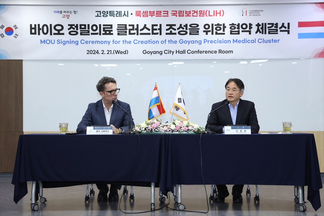 [부자동네타임즈 = 김인수 기자] 고양특례시는 지난 21일 시청 대회의실에서 룩셈부르크 국립보건원(LIH)과 경제자유구역 지정과 바이오 정밀의료클러스터 조성을 위한 업무협약을 체결했다고 밝혔다.