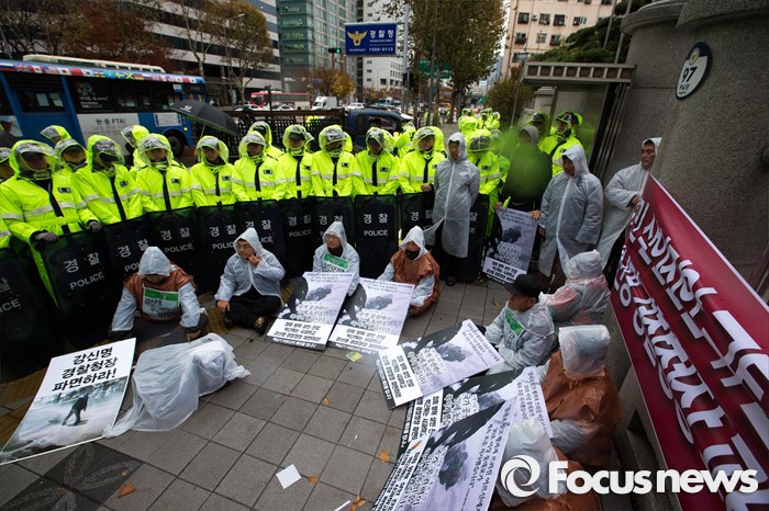 | △ 전국농민회총연맹 회원들이 지난달 18일 오후 서울 서대문구 경찰청을 기습 방문해 강신명 경찰청장과 면담을 요구하며 시위를 벌이고 있다. <사진제공=포커스뉴스> |