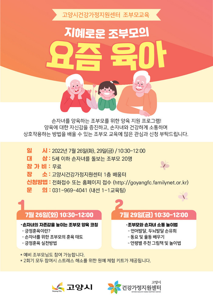 교육은 7월 26일(화), 7월 29일(금) 이틀간 고양시건강가정지원센터에서 진행되며 참가비는 무료이다. 조부모의 훈육 태도, 손자녀와의 소통 놀이법(두뇌발달 손유희, 동요 및 율동 배우기, 그림책 놀이) 등 손자녀를 육아하는 조부모에게 유용한 내용으로 진행된다.