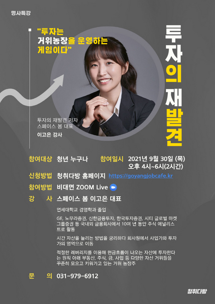 이에 따라 시는 최근 2030 청년들의 가장 큰 화제인 ‘투자’를 주제로 ‘투자의 재발견’ 저자 이고은 스페이스 봄 대표를 초청해 비대면 강연을 진행한다.