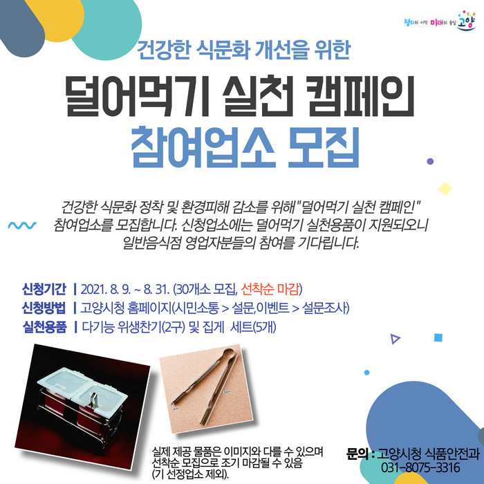[부자동네타임즈 김인수기자] 고양시가 안전한 음식문화 정착 및 음식물 쓰레기로 인한 환경 피해를 최소화 하기 위해 일반음식점 영업주를 대상으로 덜어먹기 실천 캠페인을 추진한다.