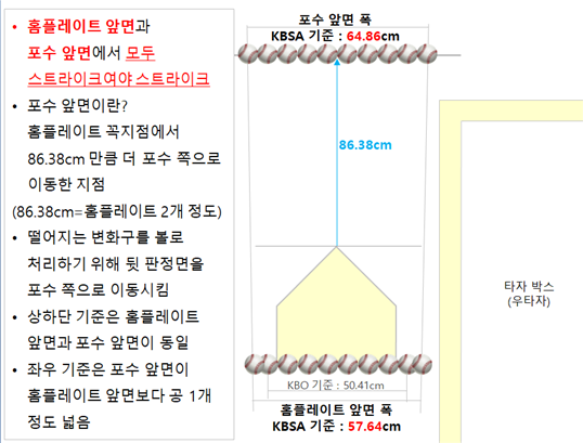 홈플레이트 앞, 뒷면 모두 존을 통과해야 스트라이크 판정을 받는 현재 구조 상 뒷 판정면을 포수 쪽으로 이동시키면서 떨어지는 변화구에 대한 판정을 보완할 수 있도록 하고, 좌우 스트라이크 존을 공 반개씩 줄여(앞면 64.87cm ➯ 57.64cm / 뒷면 72.1cm ➯ 64.86cm) 좌우 폭은 줄었고 앞 판정면보다 뒷 판정면을 공 한 개 정도 넓혀 몸쪽, 바깥쪽 꽉차는 직구성 투구들을 존에 반영했다.