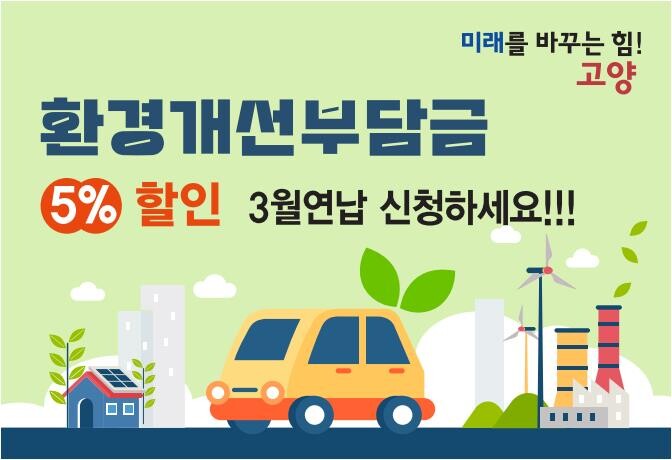 [부자동네타임즈 = 김인수 기자] 고양특례시는 환경개선부담금 납부 대상자의 부담을 덜어주고 자진 납부를 유도하기 위해 2024년 3월에도 환경개선부담금 연납 제도를 시행한다고 밝혔다.