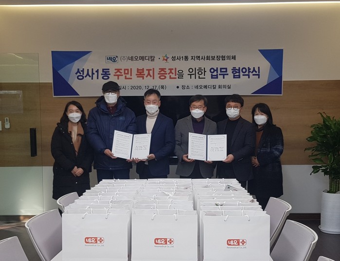 이날 협약식에서 ㈜네오메디칼은 코로나19로 어려움을 겪는 지역 내 취약계층을 위해 2,000여만원 상당의 자사 제품(마스크, 치약, 칫솔, 비누 등)을 기부했다.