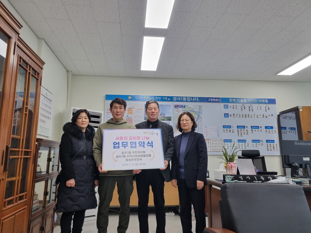 [부자동네타임즈 = 김인수 기자] 고양특례시 성사1동 주민자치회 및 지역사회보장협의체는 참숯한우천국과 지난 12일 성사1동 행정복지센터에서 취약계층 복지서비스 증진을 위한 업무협약을 체결했다.