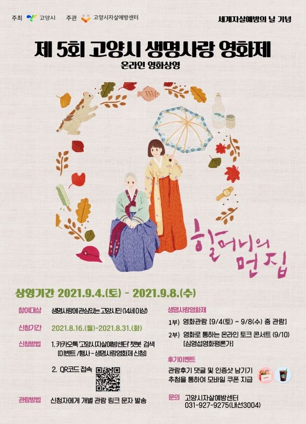 영화제는 생명사랑에 관심 있는 14세 이상 고양시민 누구나 참여할 수 있으며, 신청은 고양시 자살예방센터 챗봇 또는 QR코드 접속을 통해 8월 16일(월)부터 8월 31일(화)까지 가능하다.
