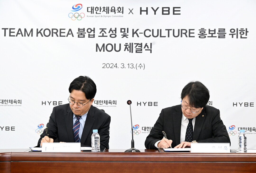 [부자동네타임즈 = 김인수 기자] 대한체육회(회장 이기흥)는 13일 주식회사 하이브(대표이사 박지원, 이하 ‘하이브’)와 올림픽 응원 문화 선도를 위한 공동 협력을 약속하는 업무협약을 체결했다.
