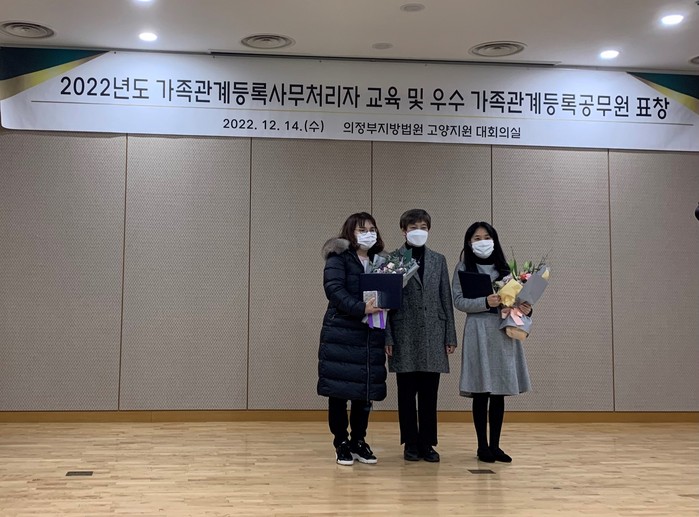 [부자동네타임즈 김인수기자] 고양특례시 일산동구는 지난 14일 의정부지방법원 고양지원 대회의실에서 가족관계등록제도 발전과 정착에 기여한 공로를 인정받아 ‘2022년 우수 가족관계등록공무원 법원행정처장상’을 수상했다고 밝혔다.