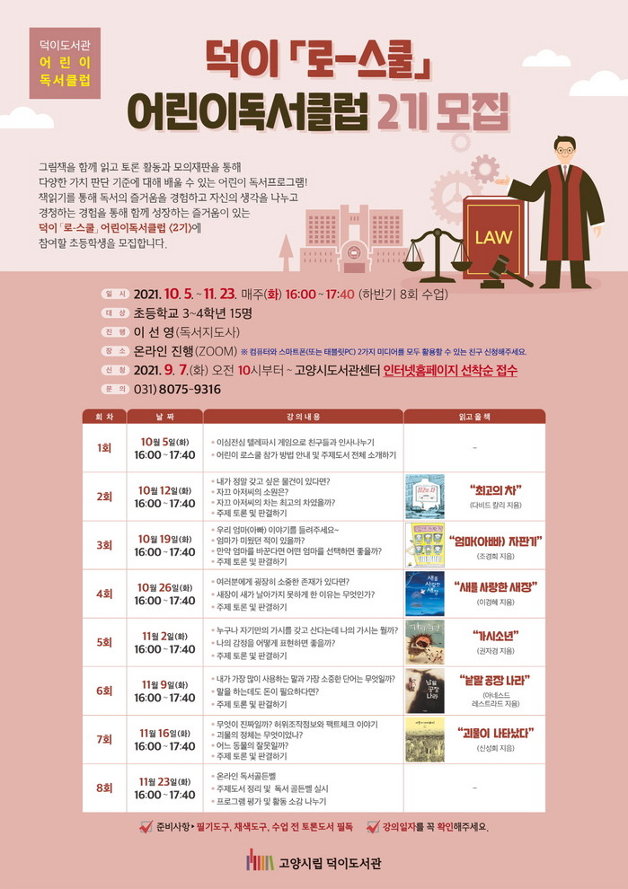 어린이 독서클럽 2기는 10월부터 11월까지 총 8회에 걸쳐 온라인(Zoom)으로 진행되며, 대상은 고양시 초등학생 3~4학년이다.