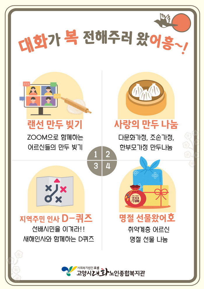 “대화가 복 전해주러 왔어흥~!”은 온라인 ZOOM을 활용하여 생활지원사와 독거어르신이 함께 만두를 빚으며 명절 분위기를 즐기고, 빚은 만두를 일산서구 내 다문화가정, 조손가정, 한부모 가정 등에 나눔 할 예정이다.