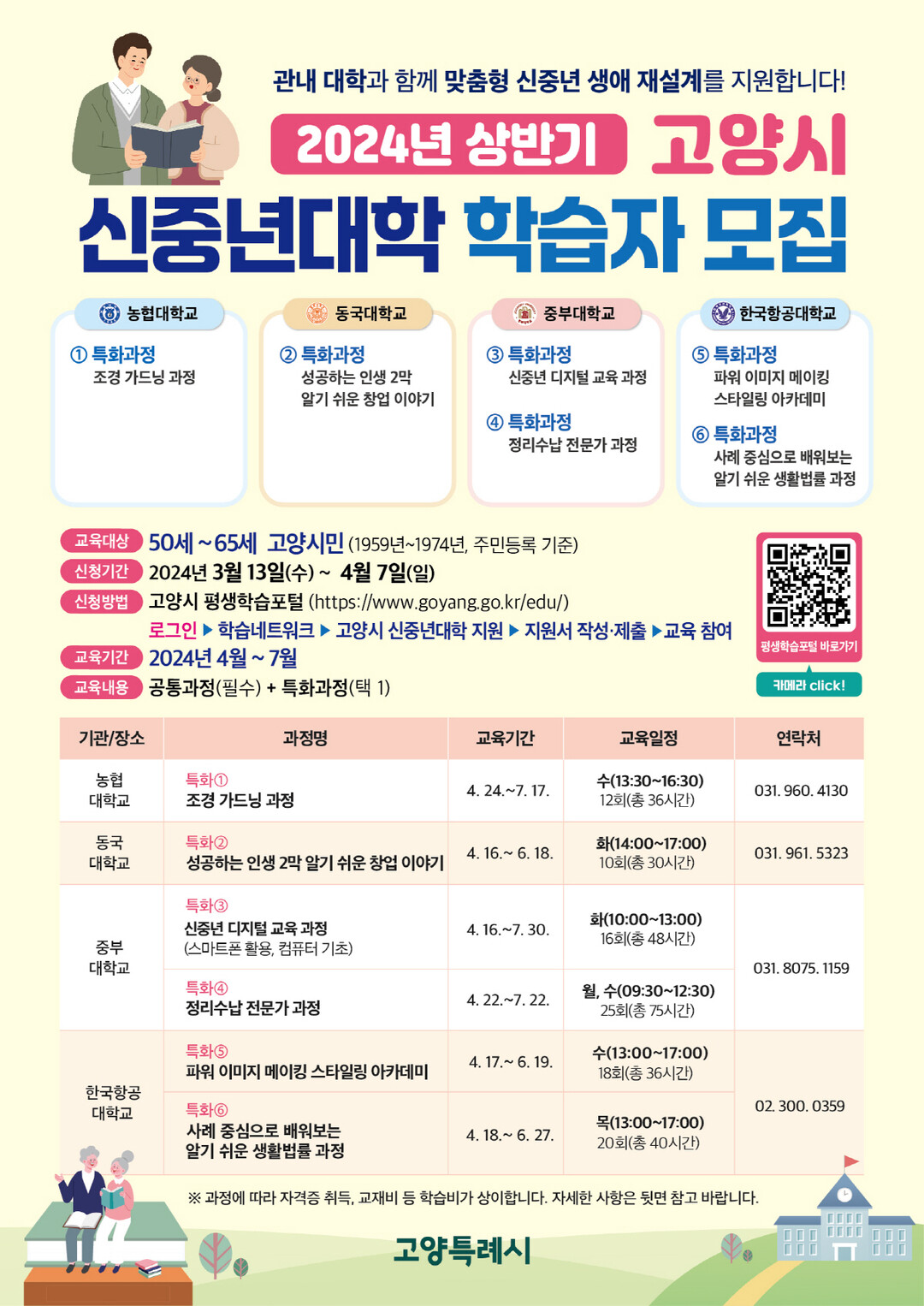 [부자동네타임즈 = 김인수 기자] 고양특례시는 4월 7일까지 2024년 상반기 고양시 신중년대학 학습자 180여 명을 모집한다고 밝혔다.