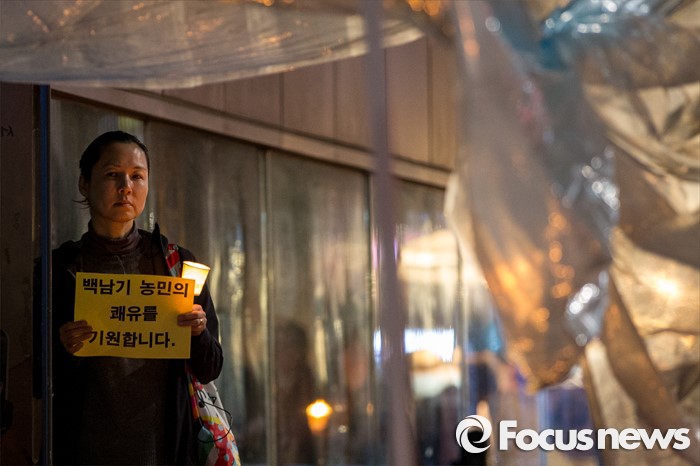 | △ 지난달 17일 오후 서울대학교병원 후문 앞에서 열린 '살인폭력진압 경찰청장 파면 및 백남기 농민 쾌유 기원 촛뷸문화제'에 참석한 시민이 쾌유를 바라는 손팻말을 들고 있다. <사진제공=포커스뉴스> |