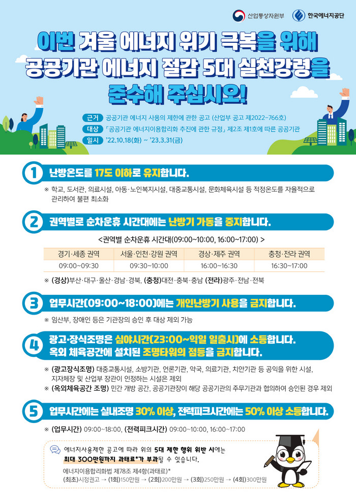 5대 실천 강령에는 ▲난방온도를 17도 이하로 유지 ▲순차운휴 시간대(09:00~09:30) 난방기 가동 중지 ▲업무시간에 개인난방기 사용 금지 ▲심야시간에 경관 조명 소등 및 조명타워 소등 ▲업무시간에 실대조명 30%이상, 전력피크시간에는 50%이상 소등이 있다.