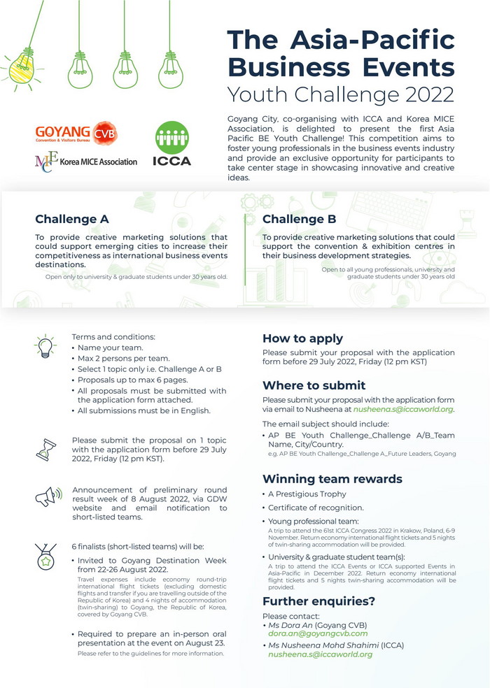 2022 고양 데스티네이션 위크 행사의 서막을 알리는 ‘아시아 태평양 비즈니스 이벤트 유스 챌린지’는 아시아 태평양 지역 내 전도유망한 청년을 육성하고 MICE 산업에서 활동할 수 있는 기회를 주기 위해 기획된 아이디어 공모전이다. 고양컨벤션뷰로는 연초부터 국제컨벤션협회(ICCA) 및 한국MICE협회와 공동 주관하며 공모전을 기획해왔으며 아시아 태평양 MICE업계에서 최초로 개최되는 이벤트이다.
