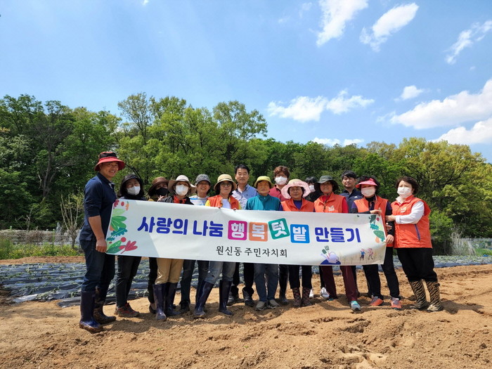 ‘사랑의 나눔, 행복텃밭 만들기’는 주민자치회 전환 이전부터 실시한 봉사 활동으로, 지역공동체에 봉사하는 뜻을 이어가기 위해 주민자치회 위원이 신원동 소재의 토지를 후원하고, 주민자치회 위원들이 도움의 손길을 더해 이어지고 있다.