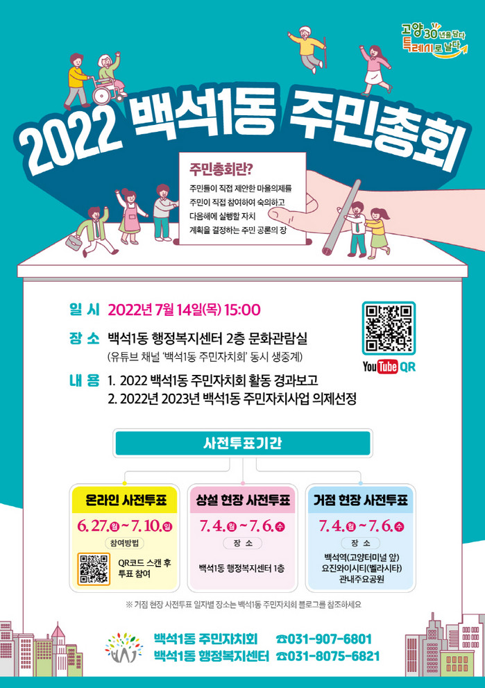 [부자동네타임즈 김인수기자] 고양시 일산동구 백석1동 주민자치회(회장 이석구)는 7월에 개최될 주민총회의 마을의제 발굴을 마치고 6월 27일부터 온라인을 통한 사전투표를 시작한다고 밝혔다.
