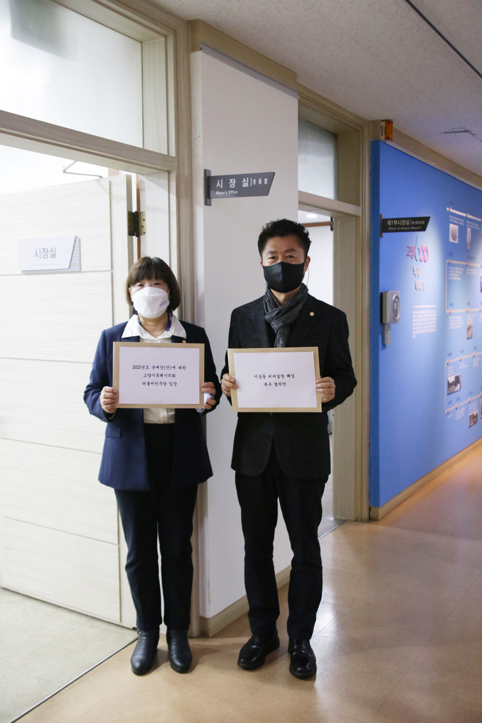 [사진설명] 지난 달 30일 고양시특례시의회 더불어민주당 (당대표 김미수의원, 이종덕의원)이 2023년도 본예산(안)에 관한 수정예산안, 이상동 비서실장 해임 촉구 결의안를 고양특례시 이동환시장에게 전달하고 있다.