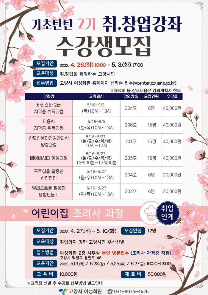 [부자동네타임즈 김인수기자] 고양시 여성회관이 고양시민의 취업준비를 지원하기 위한 취.창업 강좌를 개설하고 수강생을 모집한다. 교육 신청은 4월 26일부터 여성회관 홈페이지에서 선착순으로 접수할 수 있다.