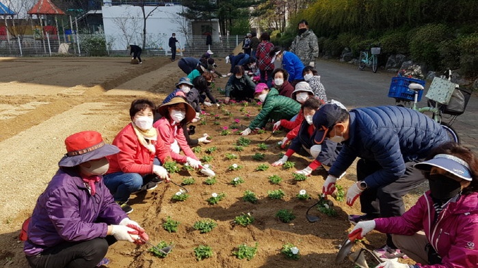 지난 4월초, 洞주민자치위원회(위원장 최경주)는 통장협의회 60명과 함께 진달래공원 옆 유휴지 1,300㎡에 피튜니아 모종 1,000주를 식재하고, 해바라기‧천일홍 등 초화류 7종의 씨앗을 뿌렸다.