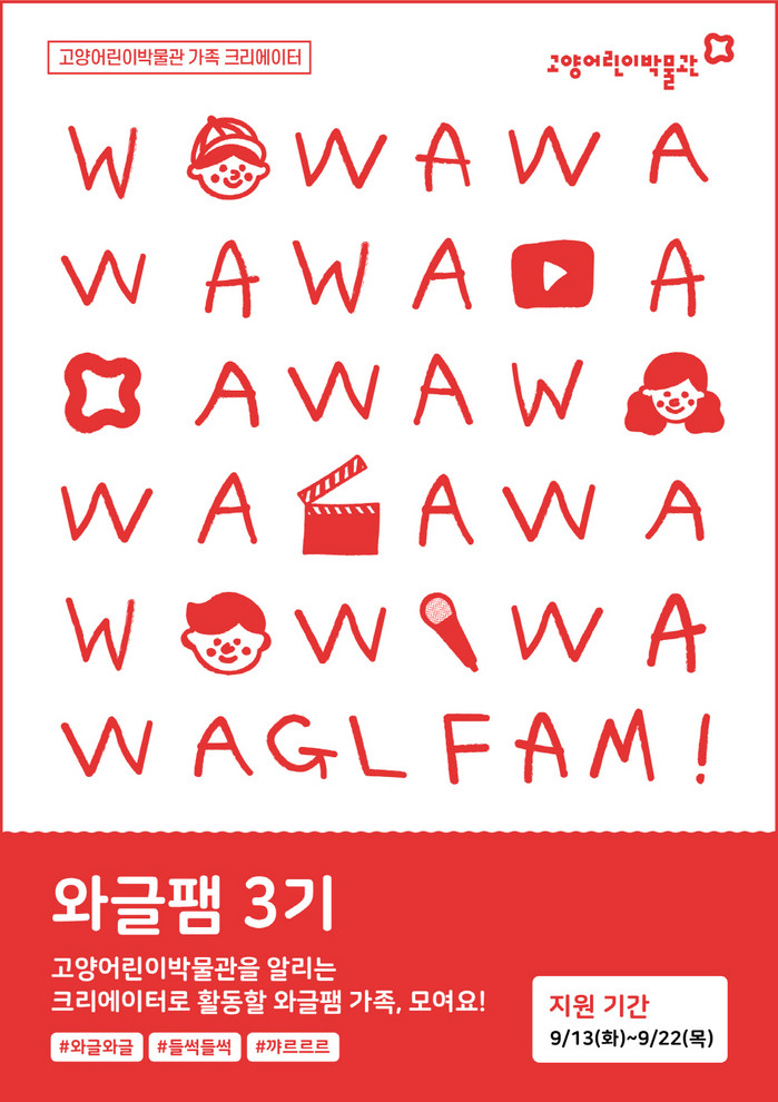 고양어린이박물관 관계자는 “고양어린이박물관을 사랑하는 마음으로 적극적인 홍보 활동을 펼칠 수 있는 가족을 기다린다.”며 “즐거운 활동과 미션으로 잊지 못할 경험을 제공하는 것은 물론 박물관과 와글팸이 함께 성장할 수 있는 값진 프로그램을 선보이겠다.”고 전했다.