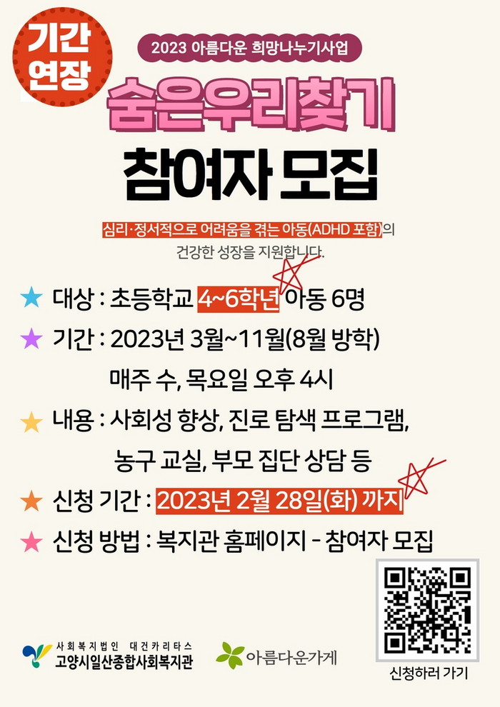 본 사업은 아름다운가게의 지원을 받아 2023년 아름다운 희망나누기 사업으로 진행된다. 한 해 동안 다양한 ADHD 아동을 발굴하고 아동이 지역사회에서 함께 성장하는 존재로 자리매김할 수 있도록 지원할 예정이다.