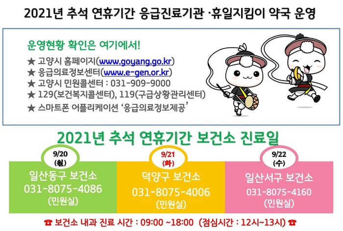 추석 연휴기간 보건소(덕양구보건소, 일산동구보건소, 일산서구보건소)와 고양시민원콜센터, 구급상황관리센터, 129보건복지콜센터를 통해 문 여는 의료기관 및 약국 운영 여부와 구급차 출동, 코로나19 선별진료소 등에 대한 신속한 안내를 받을 수 있다.
