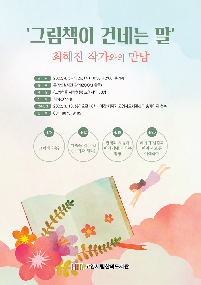 [부자동네타임즈 김인수기자] 고양시 한뫼도서관은 4월 한 달 동안 '그림책이 건네는 말' 프로그램을 온라인으로 운영한다.