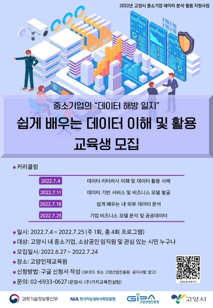 과학기술정보통신부(한국지능정보사회진흥원)가 주관하는‘2022년 고양시 중소기업 데이터 분석·활용 지원 사업’의 하나로 진행되는 이번 교육은 7월 4일(월)부터 매주 주 1회, 총 4회에 걸쳐 기본 교육과 심화 교육으로 진행된다.
