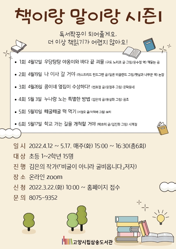‘책이랑 말이랑’프로그램은 시즌1과 시즌2로 나뉘어 각 시즌마다 총 6강으로 구성 운영될 예정이다. 이번 시즌 1 프로그램은 Zoom을 통해 비대면으로 진행되며 운영시간은 4월 17일부터 매주 화요일 15시부터 16시 30분까지이다. 프로그램 참여대상은 초등1~2학년 15명으로 오는 22일 오전 10시부터 고양시 도서관센터 홈페이지를 통해 선착순으로 모집한다.