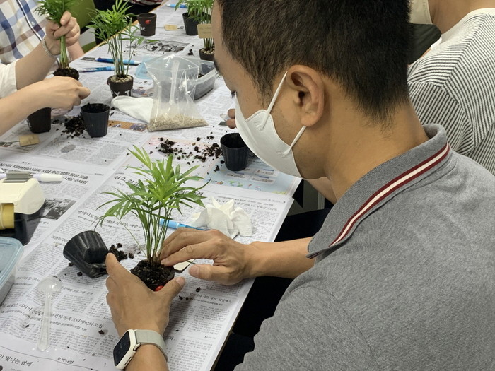 공기정화 식물인 테이블 야자와 임직원이 작성한 응원카드로 만들어진 『커피박 화분 반려식물』은 고양시대화노인복지관에 전달했다.